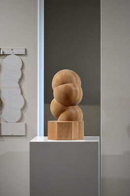 The base is a trace of an octagonal prism in its pre-carved state, and the irregular four-sided drawing on the wall behind the work shows the process of defining the outline as seen from each perspective.